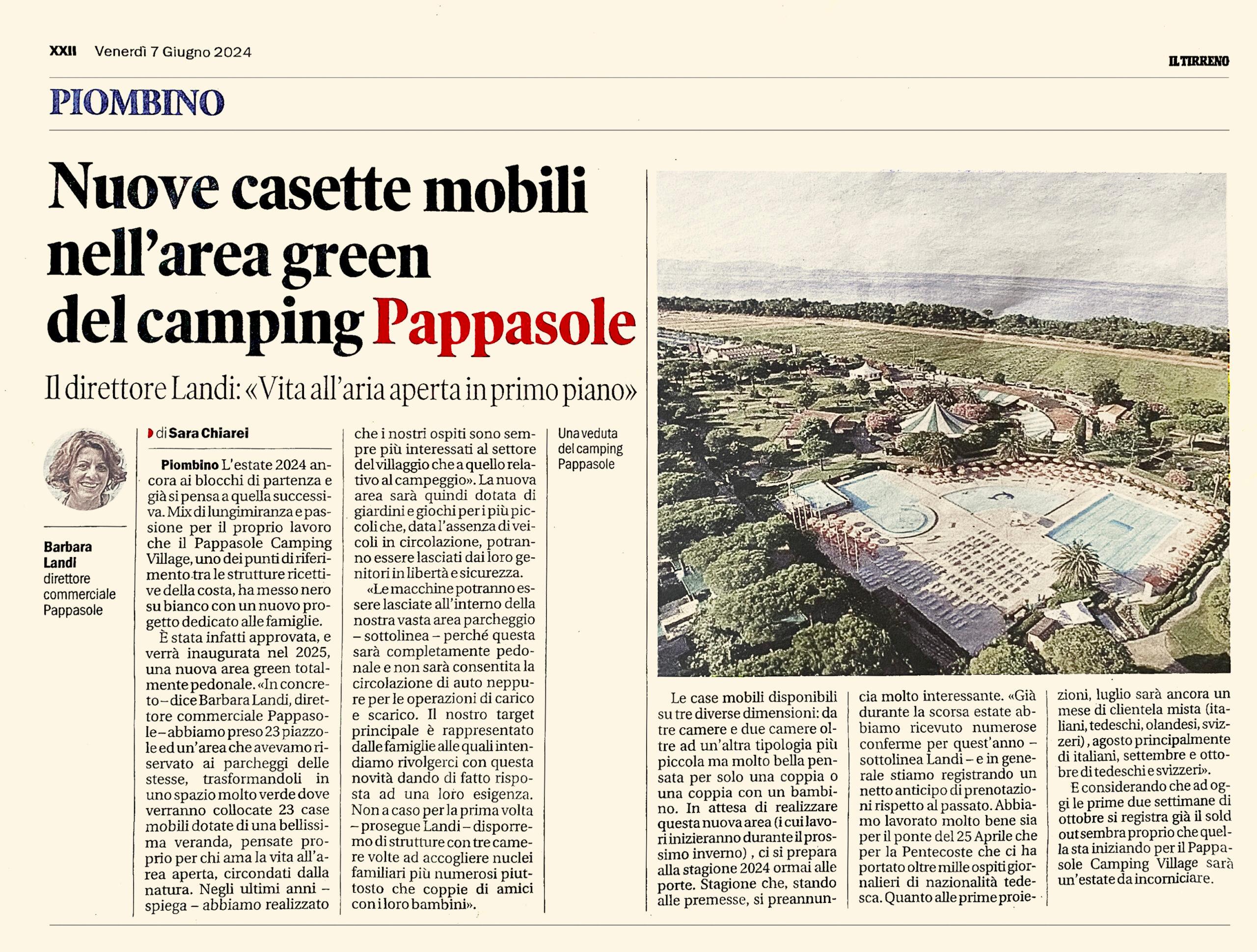 È stata infatti approvata, e verrà inaugurata nel 2025, una nuova area green totalmente pedonale. «In concreto – dice Barbara Landi, direttore commerciale Pappasole – abbiamo preso 23 piazzole ed un’area che avevamo riservato ai parcheggi delle stesse, trasformandoli in uno spazio molto verde dove verranno collocate 23 case mobili dotate di una bellissima veranda, pensate proprio per chi ama la vita all’area aperta, circondati dalla natura. Negli ultimi anni – spiega – abbiamo realizzato che i nostri ospiti sono sempre più interessati al settore del villaggio che a quello relativo al campeggio». La nuova area sarà quindi dotata di giardini e giochi per i più piccoli che, data l’assenza di veicoli in circolazione, potranno essere lasciati dai loro genitori in libertà e sicurezza.