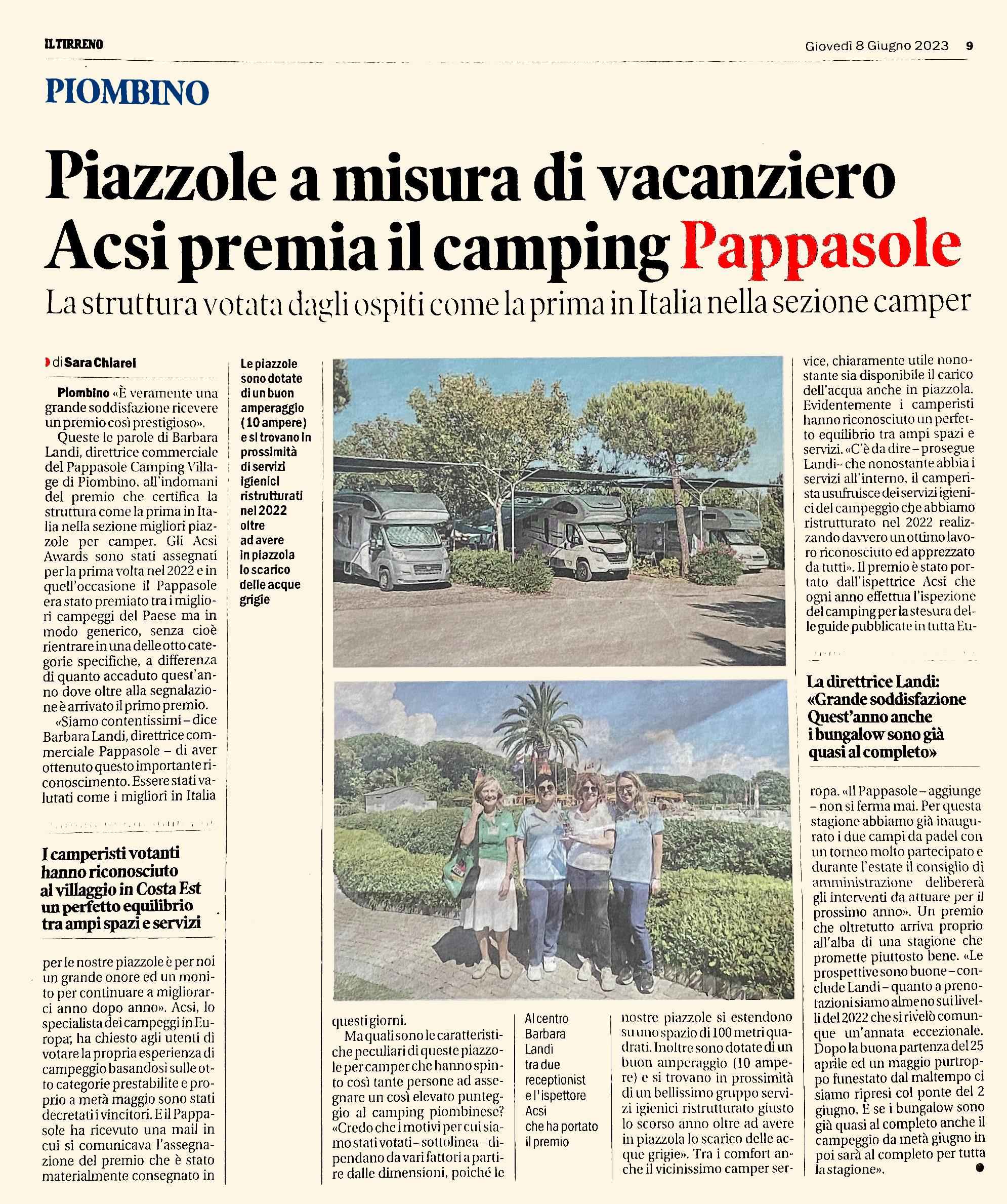 Acsi è la guida internazionale dei campeggi, diffusa a livello europeo. E ha posato gli occhi proprio in questa struttura, nata nel Golfo di Follonica a fine anni Ottanta. Da allora il Pappasole ha sempre creduto nel turismo e ha investito ogni anno per migliorare i propri servizi, per stare al passo con i tempi e rispondere alle esigenze degli ospiti. «Siamo orgogliosi per il risultato degli ACSI Award categoria Best Motorhome pitches – spiega la direttrice commerciale Barbara Landi, che ha ritirato personalmente il premio dall’ispettrice Carine Goudesine. «Ringraziamo i campeggiatori europei che hanno votato in massa per i loro campeggi preferiti – dice ancora – e che ci hanno scelto come il migliore campeggio italiano della categoria».